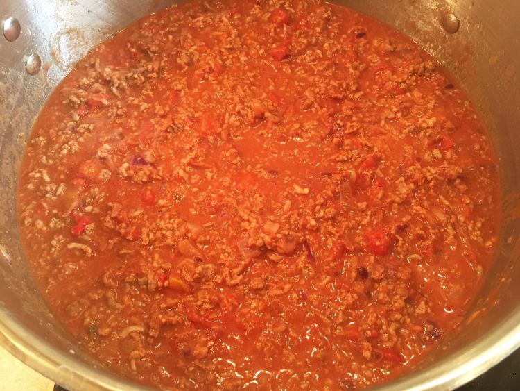Add the tinned chopped tomatoes to the mixture and stir (don’t forget to add a little water to each empty can to get the last of all those juices). White wine is added with a couple of crumbled beef stock cubes.
