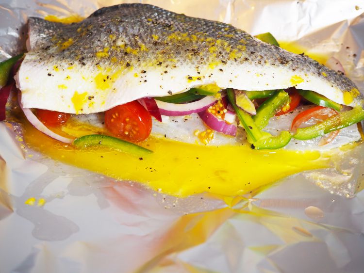 - Sea Bass fillets with onion, tomatoes, peppers