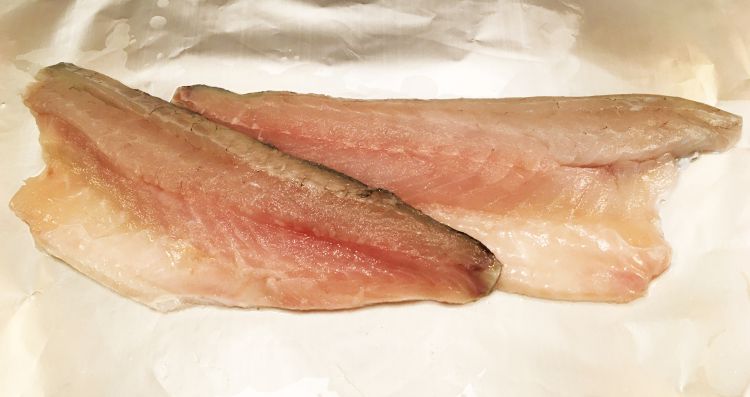 Wash the sea bass fillets and place one on a pre-oiled sheet of bacofoil in an oven proof dish with the skin side facing down.