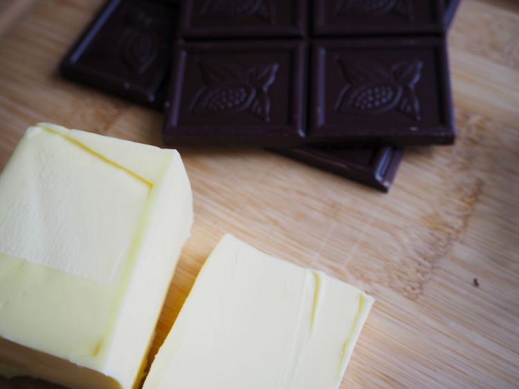 Fill a saucepan with water. Place a bowl with the butter and dark chocolate on top of the saucepan. Slowly heat the water but don't allow the water to touch the bowl. Once the butter and dark chocolate has melted, leave aside to cool.